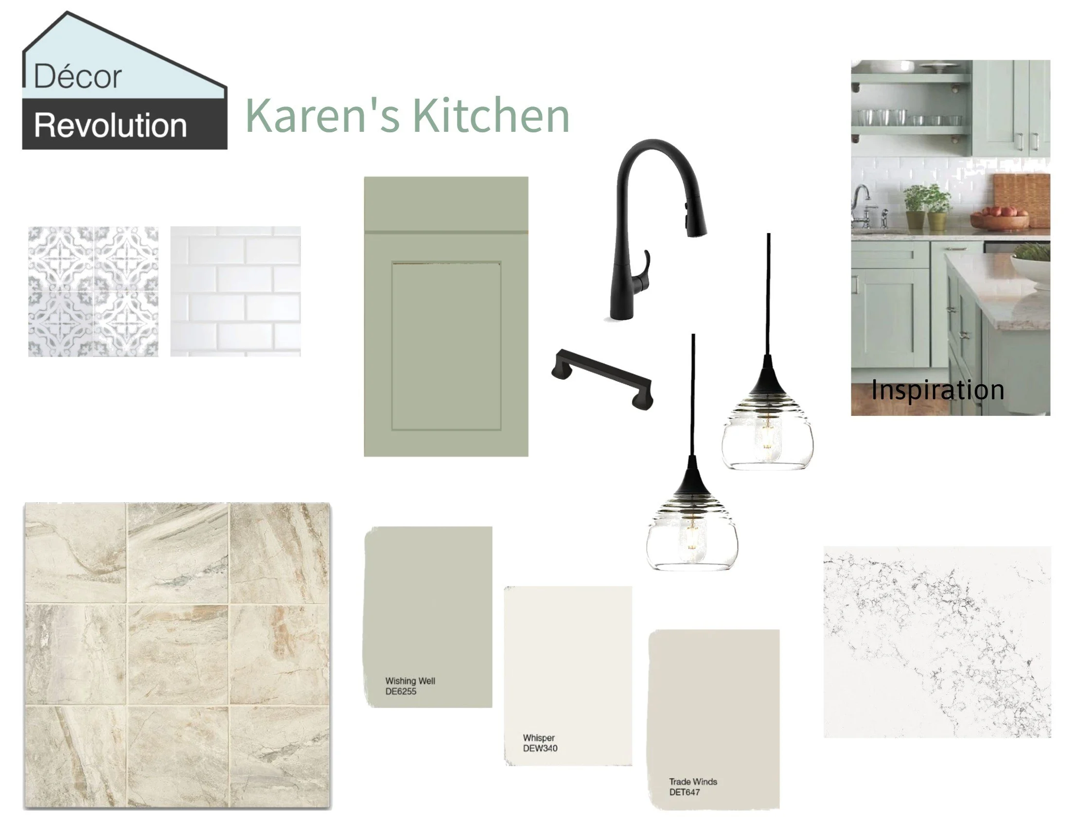Our last example is of this kitchen, where the walls are white representing the 60% dominant color. The cabinets are the soft sage green, the beige floors and the gray veining in the quartz countertop and all represent the secondary colors which are the 30%. And the black is the 10% accent color on the sink faucet, light fixtures and cabinet hardware. They add that pop of color.