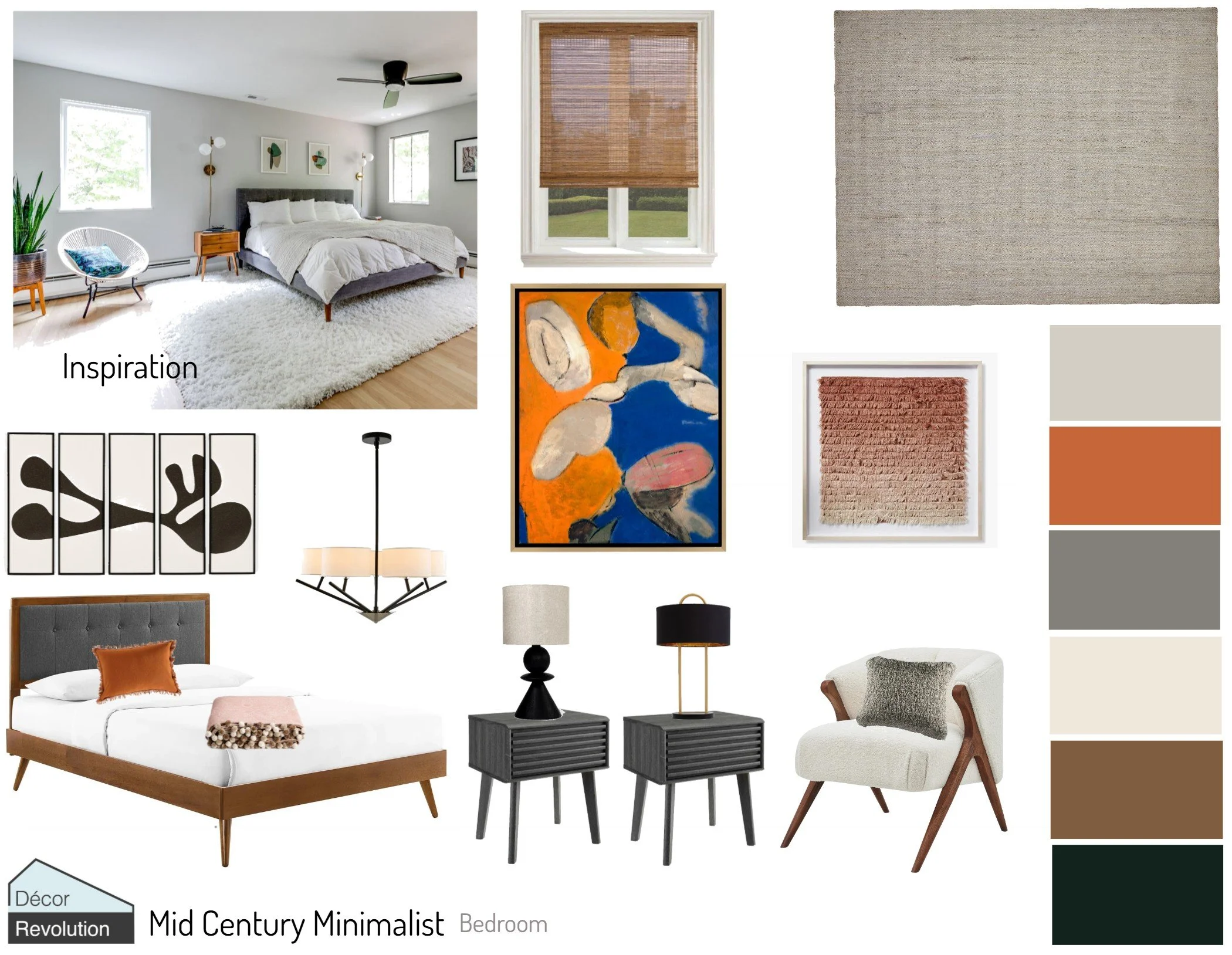 In this mid-century minimalist bedroom space, you can see how the wall color is a pale gray and it is the dominant color being 60% of the space. The secondary colors, the brown, darker gray and ivory, support this on the furniture, bedding and window treatments. This is 30% of the color. And the accent color, which is 10%, is the orange in the artwork and pillows.